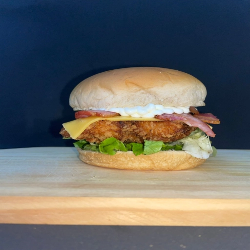 Pão de brioche, filé de frango empanado, queijo, bacon, cream cheese, salada e molho da casa