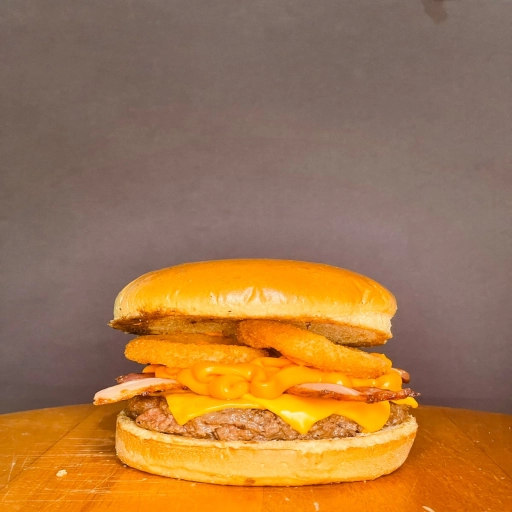 Pão de brioche, 120g de carne artesanal, queijo, bacon, 2 cebolas onion, cheddar e molho de pimenta