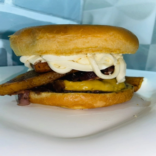 Pão de brioche, 120g de carne artesanal, queijo, bacon, alho torrado, cream cheese e banana da terra
