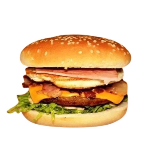 Pão, carne, queijo, presunto, ovo, bacon, salada e molho especial